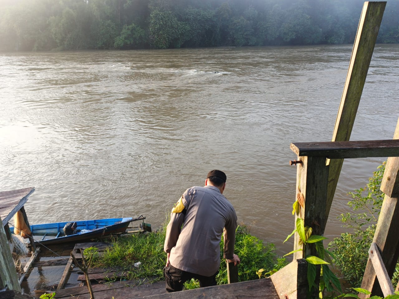 Lamandau – Personel Polsek Lamandau Melaksanakan Patroli dan Pantau Cek debit air Sungai Lamandau Antisipasi terjadinya Bencana banjir di Wilayah Kabupaten Lamandau Khususnya Kecamatan Lamandau yang bertempat di Dermaga Tapin Bini, kecamatan Lamandau, Kabupaten Lamandau, Provinsi Kalteng, Rabu (14/1/26) Pagi.