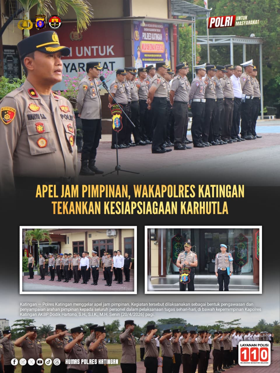 Katingan — Polres Katingan menggelar apel jam pimpinan. Kegiatan tersebut dilaksanakan sebagai bentuk pengawasan dan penyampaian arahan pimpinan kepada seluruh personel dalam pelaksanaan tugas sehari-hari, di bawah kepemimpinan Kapolres Katingan AKBP Dodik Hartono, S.H., S.I.K., M.H. Senin (20/4/2026) pagi.