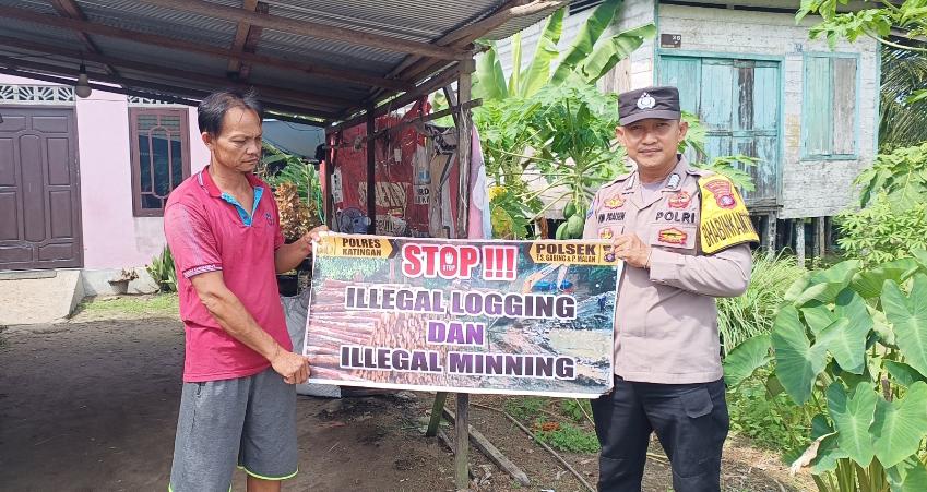Polres Katingan- Bhabinkamtibmas Polsek Tewang Sangalang Garing dan Pulau Malan, Polres Katingan, Polda Kalteng, Bripka Jon Praisen, menyampaikan imbauan pencegahan aktivitas penebangan hutan secara liar (ilegal logging) dan pertambangan tanpa ijin (ilegal minning) kepada warga Kecamatan Tewang Sangalang Garing, Rabu (22/04/2026) pagi.